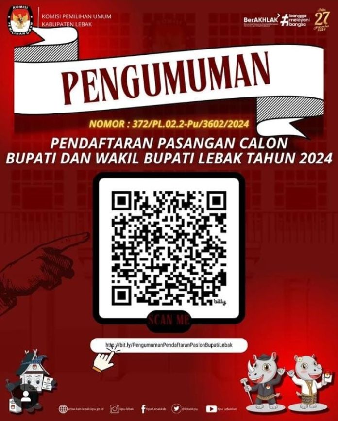 JBNLEBAK – PENGUMUMAN NOMOR : 372/PL.02.2-Pu/3602/2024. TENTANG PENDAFTARAN PASANGAN CALON BUPATI DAN WAKIL BUPATI DAN WAKIL BUPATI LEBAK TAHUN 2024
