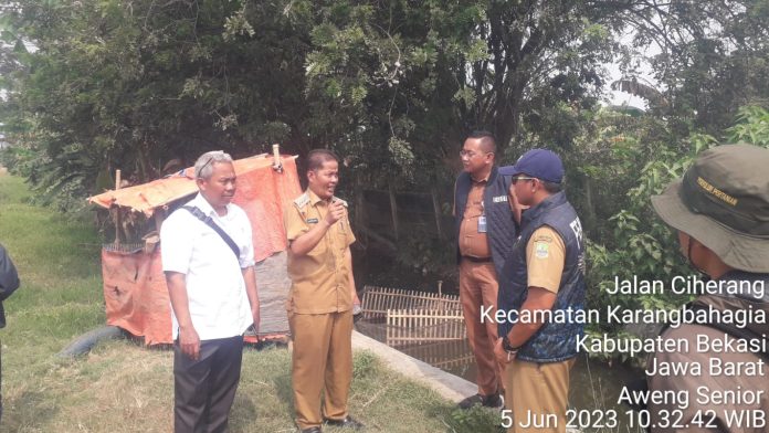 Camat Karangbahagia Karnadi S.Sos. MM didampingi Pengamat Jasa Tirta (PJT) wilayah II ambil langkah-langkah tanggap darurat kekeringan lahan persawahan yang ada di se-Kecamatan Karangbahagia supaya bisa terairi, pada Senin (05/06/2023).