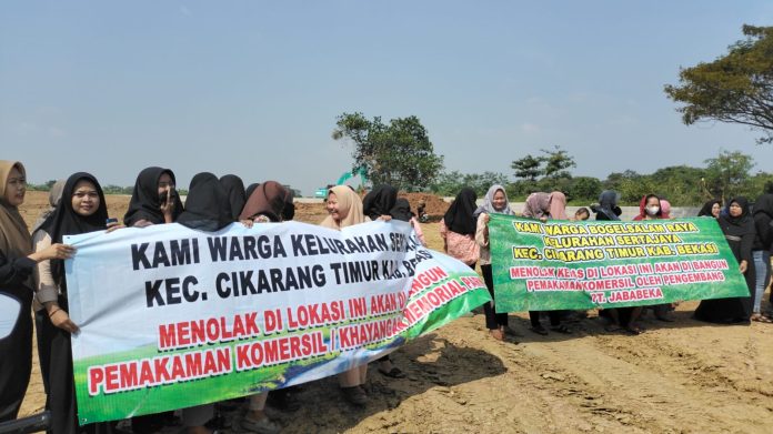 Bekasi (JBN) – Warga Kelurahan Sertajaya, Kecamatan Cikarang Timur, Kabupaten Bekasi, tolak pembangunan TPU yang ada di lingkungannya, dengan datang beramai-ramai sambil membawa spanduk sebagai tanda penolakan, pada Jum’at (2/6/2023).