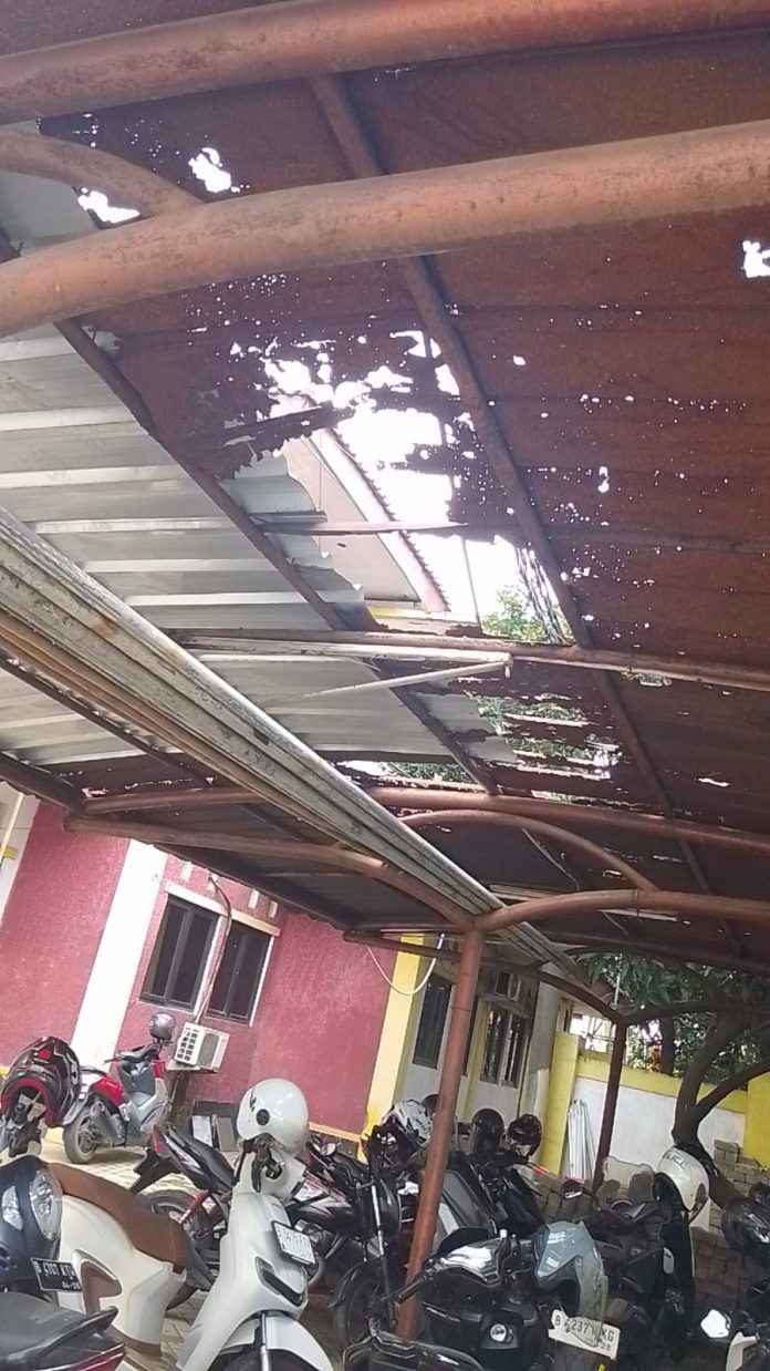 JBN Bekasi – Awning (auning) parkiran motor pegawai Kecamatan Cikarang Barat, Kabupaten Bekasi, Jawa Barat, saat ini terlihat sangat tidak terawat, bahkan dilokasi terlihat atapnya pun sudah tidak berfungsi karena banyak yang berlubang dan berkarat.