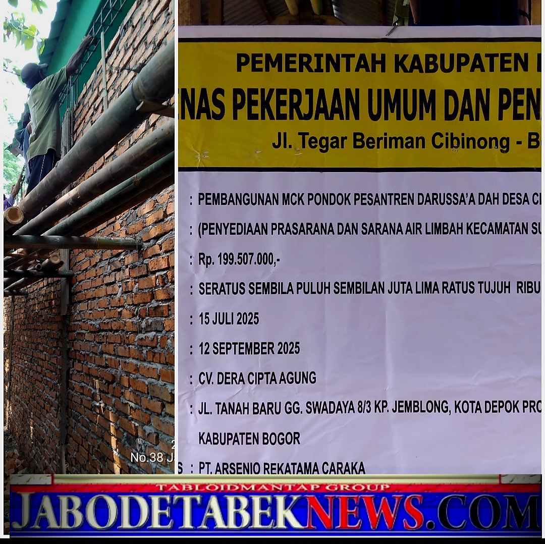 Sebagai informasi, proyek pembangunan MCK Pondok Pesantren Darussa’adah di Desa Cijujung, Kecamatan Sukaraja merupakan proyek dari DPUPR Kabupaten Bogor dengan Nilai Pagu Rp 199.507.000,- dikerjakan oleh CV DERA CIPTA AGUNG dan diawasi oleh Konsultan Pengawas PT ARSENIO REKATAMA CARAKA. (RDI/Fendi)