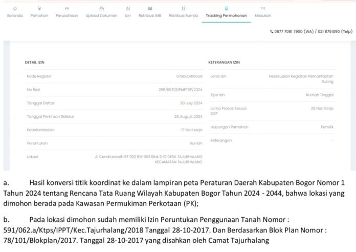 JBN Tajur Halang – Legalitas dokumen IMB (Ijin Mendirikan Bangunan) berikut dengan IPPT (Ijin Penggunaan Peruntukan Tanah) pada klaster perumahan Ariesta Residence Tajur Halang terindikasi bermasalah. Hal itu terkuak setelah adanya pernyataan resmi dari DPMPTSP Kabupaten Bogor menindaklanjuti permohonan Persetujuan Kesesuaian Kegiatan Pemanfaatan Ruang (KKPR) Non Berusaha yang dimohonkan A/N (E) untuk lokasi koordinat Blok D.06 dan D.10 klaster Ariesta Residence Tajurhalang.
