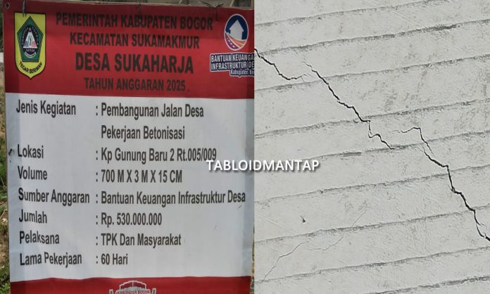 JBN Sukamakmur – Hasil kegiatan pembangunan infrastruktur pekerjaan jalan desa yang berlokasi di Kp gunung batu dua RT 005/RW 009 desa sukaharja, yang merupakan realisasi program (bangkeu) bantuan keuangan Tahun anggaran 2025 telah menelan biaya sebesar setengah milyar lebih itu jauh dari kata baik.
