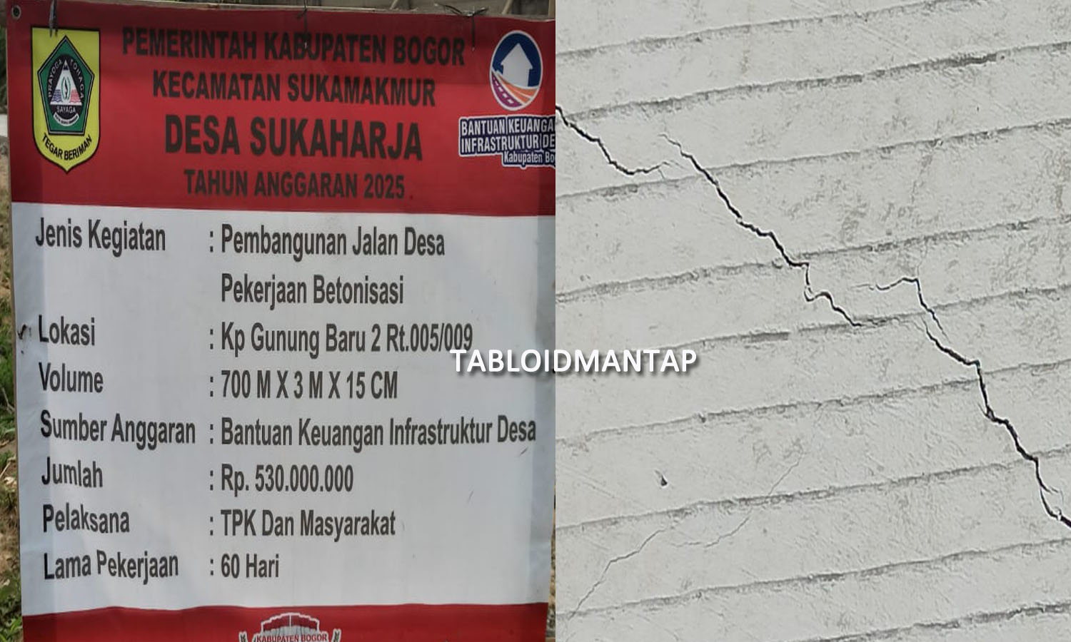 “Sekedar informasi pekerjaan tersebut tidak sesuai dengan papan informasi pengerjaan TPK dan masyarakat pada kenyataannya yang mengerjakan orang dari luar bogor, dan lama pekerjaan 60 hari, pada dasarnya pekerjaan dari mulai pembukaan jalan pengerasan dan sampai betonisasi nyatanya cuma 7 hari pekerjaan yang kerjanya kurang lebih ada sekitar 15 orang dan di kerjakan secara ugal ugalan karena pengen cepat selesai, soalnya di borongkan, kalau orang ngeborong pekerjaaan pasti pengen cepat, karena pemborong juga pengen untung yang besar, sehingga hasilnya sangat jelek sekali baru selesai sudah pada retak kemungkinan dua bulan juga sudah rusak lagi,” sambung warga menjelaskan.