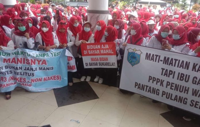 JBN Pandeglang-Ratusan tenaga kesehatan (nakes) honorer kategori R2 dan R3 di Kabupaten Pandeglang, Banten, menggelar aksi unjuk rasa di depan kantor Bupati Pandeglang pada Kamis (16/01/2025). Mereka menolak hasil seleksi Pegawai Pemerintah dengan Perjanjian Kerja (PPPK) tahun 2024 dan mendesak pemerintah untuk mengutamakan penyelesaian pengangkatan honorer yang sudah terdata di Badan Kepegawaian Negara (BKN).