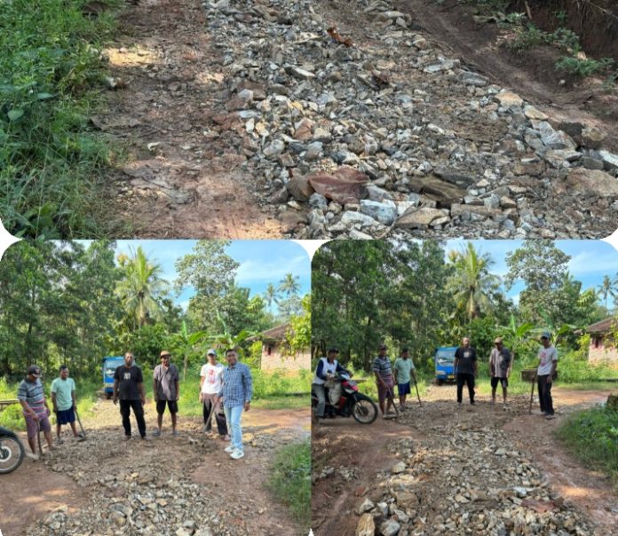 Wakil Ketua Komisi 3 DPRD Pringsewu dari Fraksi NasDem, Rusmanto, memberikan bantuan material sabes untuk perbaikan jalan lingkungan di Pekon Pandansari Selatan, Dusun 2, RT 6.