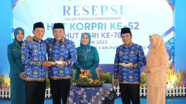 JBN Sampang – Bupati Sampang H. Slamet Junaidi bersama Wakil Bupati H. Abdullah Hidayat menghadiri resepsi HUT ke-52 Korps Pegawai Republik Indonesia (KORPRI) DAN HUT KE-78 Persatuan Guru Republik Indonesia (PGRI) Tahun 2023 di Pendapa Trunojoyo, Senin (18/12/2023).