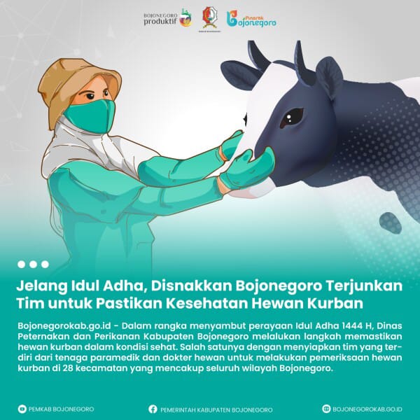 Bojonegoro ( JBN) – Dalam rangka menyambut perayaan Idul Adha 1444 H, Dinas Peternakan dan Perikanan Kabupaten Bojonegoro melakukan langkah memastikan hewan kurban dalam kondisi sehat. Salah satunya dengan menyiapkan tim yang terdiri dari tenaga paramedik dan dokter hewan untuk melakukan pemeriksaan hewan kurban di 28 kecamatan yang mencakup seluruh wilayah Bojonegoro.