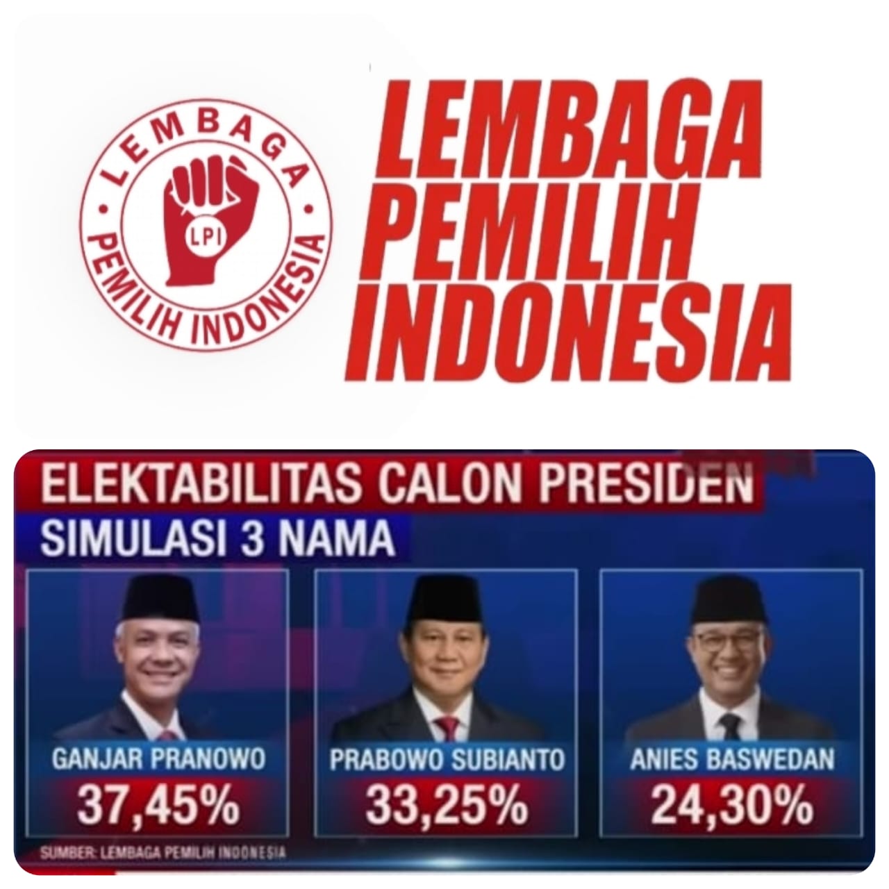 Elektabilitas pasangan calon presiden dan wakil presiden Ganjar Pranowo dan Mahfud MD yang mengantongi nomor urut 3 tercatat unggul dari dua kandidat lainnya yaitu Prabowo Subianto dan Anies Baswedan sebanyak 37,45 persen. Angka tingkat keterpilihan tersebut berdasarkan survey yang dikeluarkan oleh Lembaga Pemilih Indonesia (LPI), Kamis (16/11/2023).