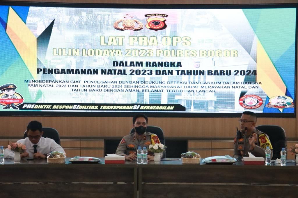 JBN Polres Bogor – Melakukan Kegiatan Lat Pra Ops Lodaya 2023 Dalam Rangka pengamanan Natal 2023 dan Tahun Baru 2023 Yang bertempat di aula Sanika Satyawada Kamis 21 Desember 2023, mulai pukul 09.00 WIB sd 09.40 yang dipimpin oleh Wakapolres Bogor Kompol Adhimas Sriyono Putra S.I.K. M.M didampingi Kabag Ops Polres Bogor, Kompol Bayu Tri Nugraha, S.E,S.I.K,M.M dan Kasat Intelkam Polres Bogor AKP Ari Nugroho, S.I.K., M.Si
