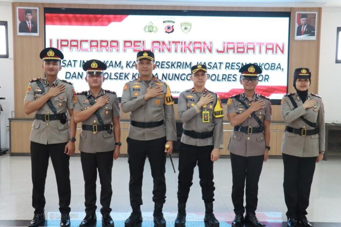 JBN Cibinong – Upacara Pelantikan jabatan Kasat dan Kapolsek yang alami pergeseran jabatan di gelar Polres Bogor, pada Selasa, 17 Oktober 2023, di Aula Sanika Satyawada Polres Bogor.