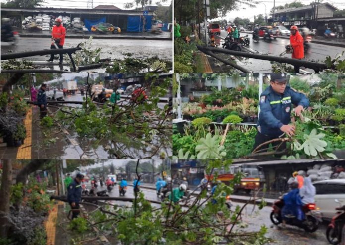 JBN Polres Bogor – Polsek Sukaraja Polres Bogor Polda Jabar, Hujan deras disertai angin kencang yang mengguyur wilayah Kecamatan Sukaraja, Kabupaten Bogor menyebabkan pohon tumbang pada Jumat, 3 November 2023. (4/11/2023)
