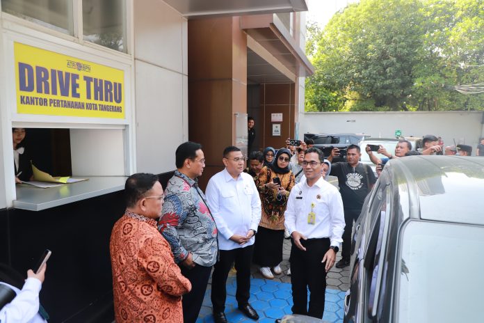 JBNTangerang – Wakil Menteri Agraria dan Tata Ruang/Wakil Kepala Badan Pertanahan Nasional, Ossy Dermawan bersama Pimpinan Ombudsman Republik Indonesia Yeka Hendra Fatika mengunjungi Kantor Pertanahan Kota Tangerang untuk melihat langsung inovasi layanan *Drive Thru* dan *Kantor Virtual*, Rabu (23/07/2027).