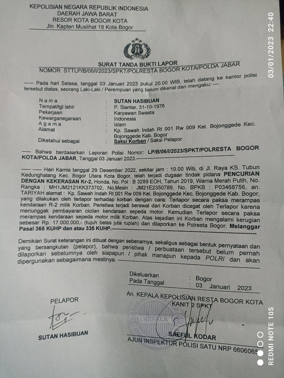 Sebagai informasi, untuk LP/B/06/1/2023//SPKT/POLRESTA BOGOR, penyidik mencantumkan Pasal 365 KUHP (pencurian dilakukan pada waktu malam dalam sebuah rumah atau perkarangan tertutup yang ada rumahnya, dijalan umum, atau dalam kereta api atau trem yang sedang berjalan) dengan ancaman penjara maksimal 9 Tahun penajara dan Subsider Pasal 335 KUHP (Barang siapa secara melawan hukum memaksa orang lain supaya melakukan, tidak melakukan atau membiarkan sesuatu, dengan memakai kekerasan, atau dengan memakai) dengan ancaman maksimal 1 Tahun Penjara. (Rendy)