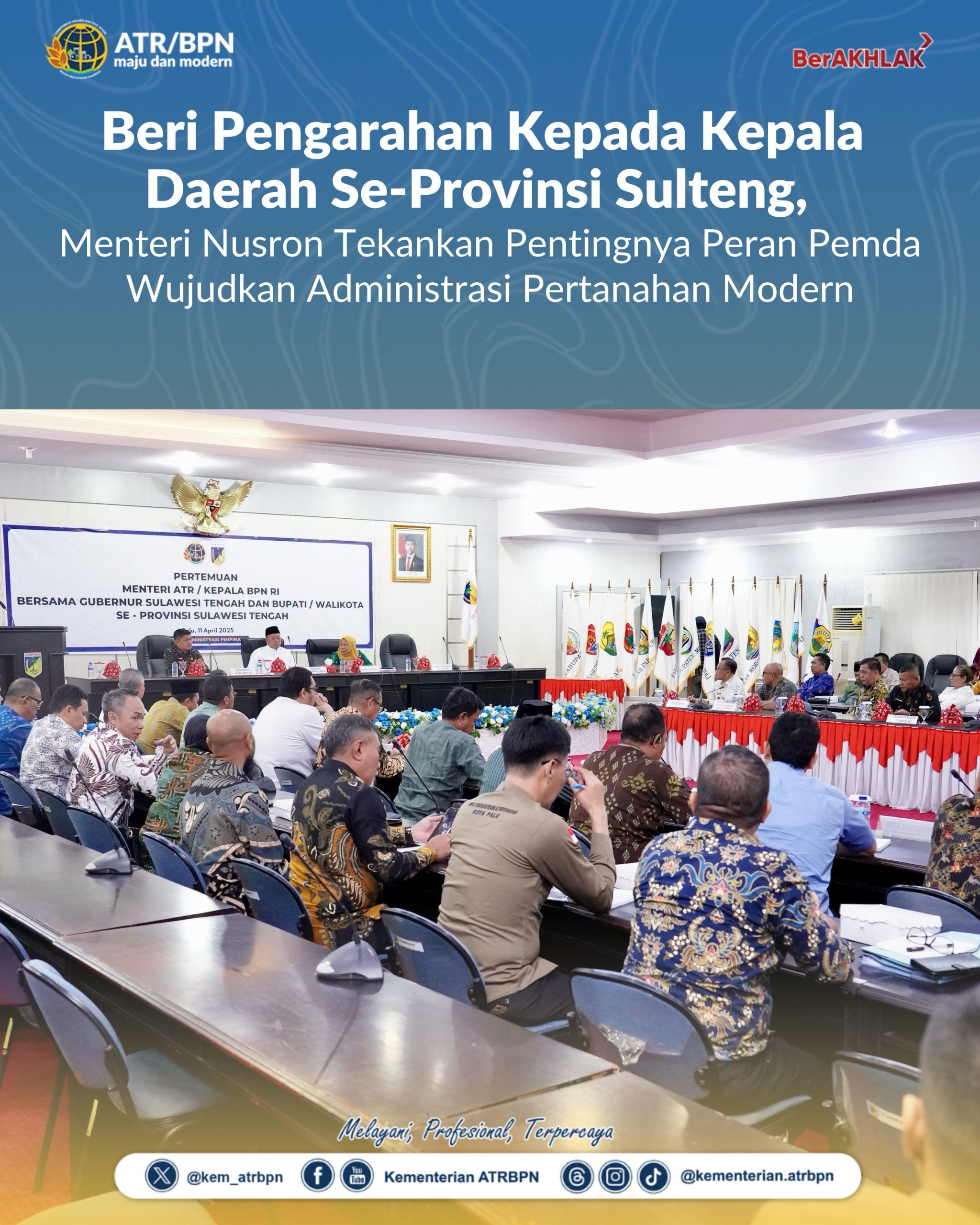 Beri Pengarahan Kepada Kepala Daerah Se-Provinsi Sulteng, Menteri Nusron Tekankan Pentingnya Peran Pemda Wujudkan Administrasi Pertanahan Modern
