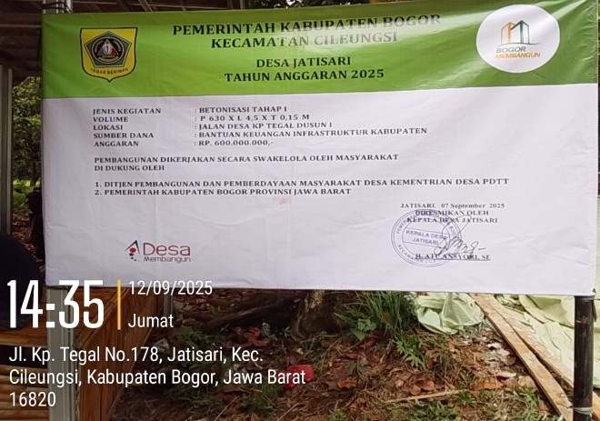Pemda, pemerintah daerah kabupaten bogor menggelontorkan dana besar yang bersumber dari APBD/uang rakyat, di buat main-main,hal ini terbukti dengan adanya rencana kegiatan proyek pembangunan betonisasi, jalan desa yang berlokasi di kampung tegal dusun satu, secara kasat mata jalan betonisasi tersebut ketebalannya kurang pas, karena dugaan ada pengurangan kualitas, dengan pagu anggaran sebesar Rp. 600.000.000.00.’ (enam ratus juta rupiah) dan dapat di duga adanya mark-up anggaran.