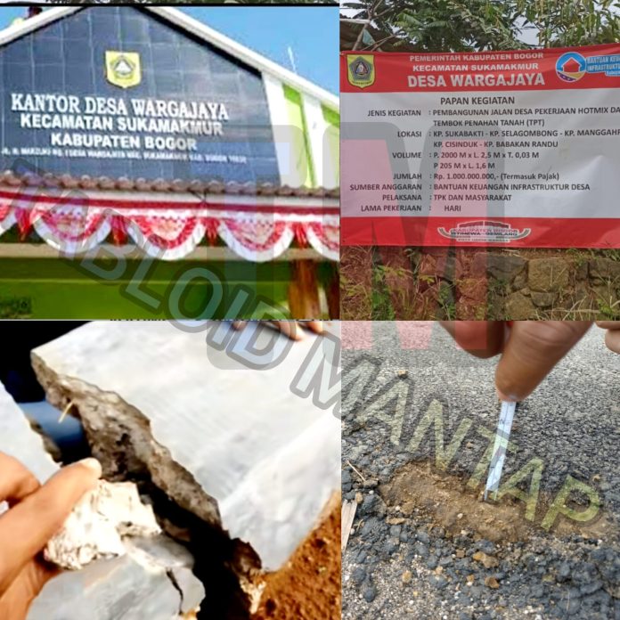Pemerintah daerah Kabupaten bogor menggelontorkan dana besar yang bersumber dari APBD/uang rakyat, di buat main-main, hal ini terbukti dengan adanya rencana kegiatan proyek pembangunan jalan desa yang berlokasi di kp sukabakti sampai dengan perbatasan kp babakan randu, secara kasat mata jalan hotmix tersebut ketebalan yang di beberapa titik hanya ada satu centi meter dan dan TPT pun pada patah karena ada dugaan pengurangan kualitas, dengan pagu anggaran RP 1000.000.000. dan dapat di duga adanya Mark-up anggaran