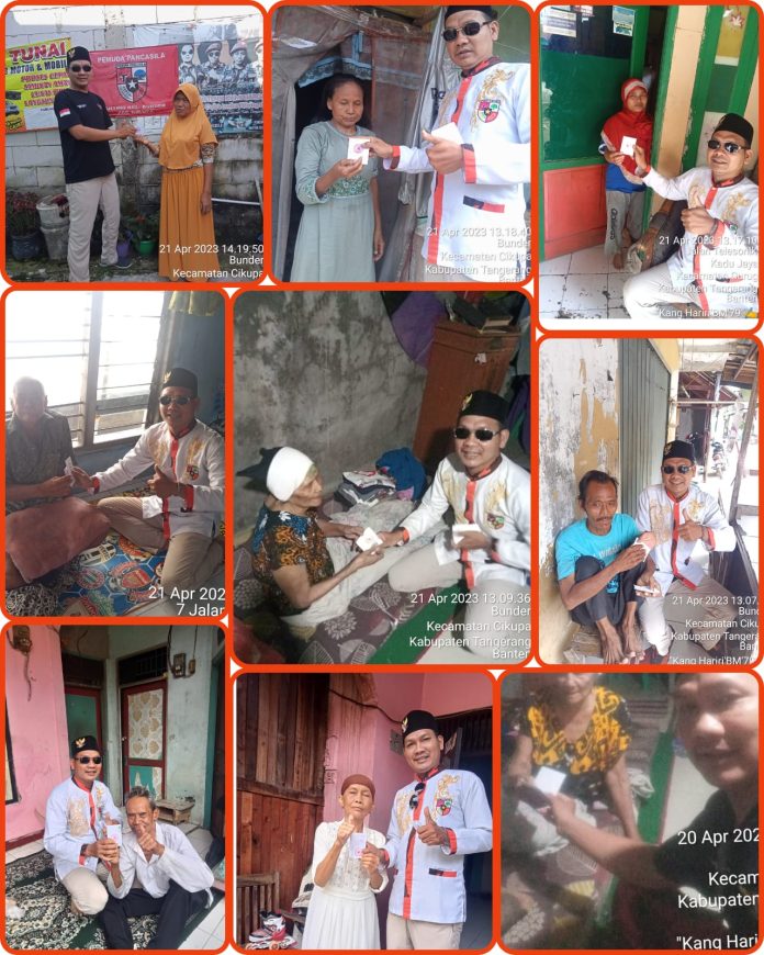 Kab Tangerang (JBN) – Organisasi Kemasyarakatan Pemuda Pancasila Ranting Kelurahan Bunder Kecamatan Cikupa Kabupaten Tangerang Provinsi Banten, Tahun ini adakan giat “Door to Door” ke tiap rumah Kaum Dhuafa khusus nya di RT 008 /02 Kelurahan Bunder yang dilaksanakan setelah Menunaikan ibadah sholat Jum’at(21/04/2023). Hasan Hariri selaku ketua Ranting Pemuda Pancasila Kelurahan Bunder mewakili untuk berbagi santunan dengan sederhana dan alakadar nya, yang terpenting ikhlas dan menjalankan sesuai ajaran Islam.