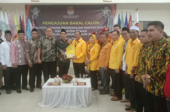 Kedatangan ketua DPD Partai Golkar berserta pengurus partai dan 55 Bakal Calon Dewan Perwakilan Rakyat Daerah (DPRD) Kabupaten Bekasi dari Partai Golkar di sambut langsung ketua KPU Kabupaten Bekasi, Jajang Wahyudi dan ketua Bawaslu Kabupaten Bekasi, Syaiful Bachri tepat pukul 16.00 WIB sore.