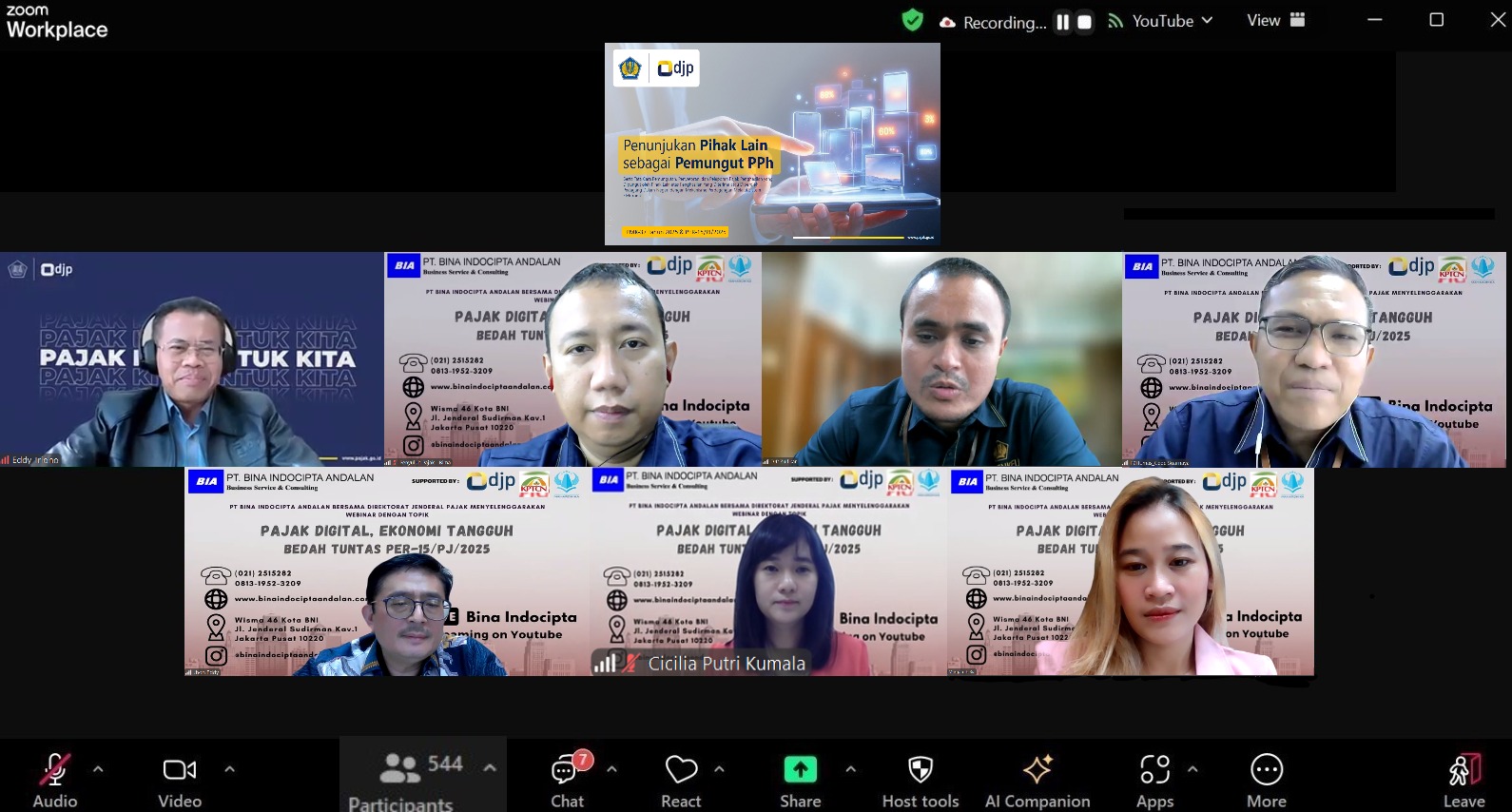 JBN Jakarta – PT. Bina Indocipta Andalan bekerja sama dengan Direktorat Humas DJP dan didukung oleh Konsorsium Pendidikan Tinggi dan Cendekiawan Nusantara serta Sekolah Tinggi Ilmu Ekonomi Mahardika Surabaya menyelenggarakan webinar dengan topik “Pajak Digital, Ekonomi Tangguh Bedah Tuntas Per-15/PJ/2025”. Kegiatan webinar ini membahas secara mendalam PER-15/PJ/2025 yang mengatur mengenai batasan kriteria pihak lain serta penunjukan marketplace sebagai pemungut, penyetor, dan pelapor Pajak Penghasilan (PPh) atas penghasilan pedagang dalam negeri melalui sistem perdagangan elektronik (PMSE).