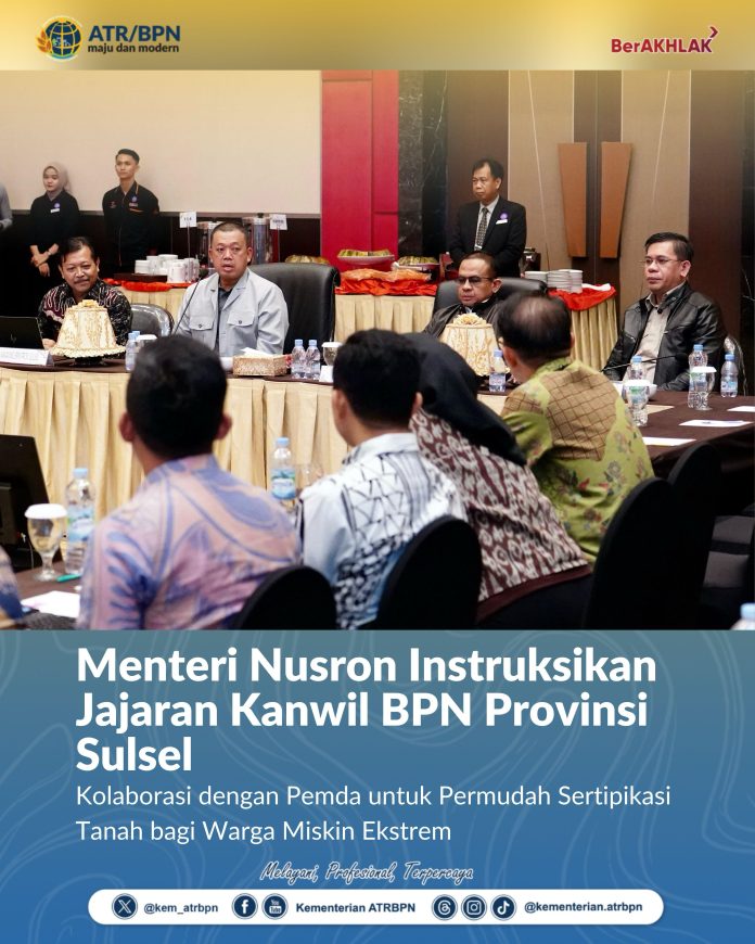 JBN Makassar – Menteri Agraria dan Tata Ruang/Kepala Badan Pertanahan Nasional (ATR/BPN), Nusron Wahid, mendorong jajaran Kantor Wilayah (Kanwil) BPN Provinsi Sulawesi Selatan (Sulsel) untuk berkolaborasi dengan pemerintah daerah (Pemda) dalam mempercepat proses sertipikasi tanah. Hal itu diperlukan untuk percepatan program Pendaftaran Tanah Sistematis Lengkap (PTSL).