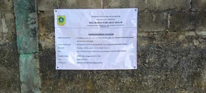 Cibinong (JBN) – Lalai dalam pelaksanaan peningkatan jalan infrastruktur yang tidak memasang/ keterlambatan memasang papan nama/plang proyek oleh pihak LPM Kelurahan Pabuaran Mekar Kecamatan cibinong Kabupaten Bogor merupakan pelanggaran terkesan mengabaikan Undang – Undang. Senin 8/05/2023