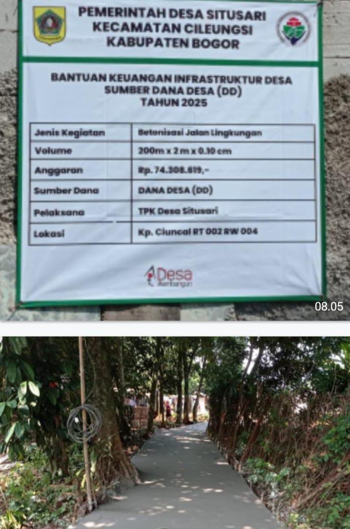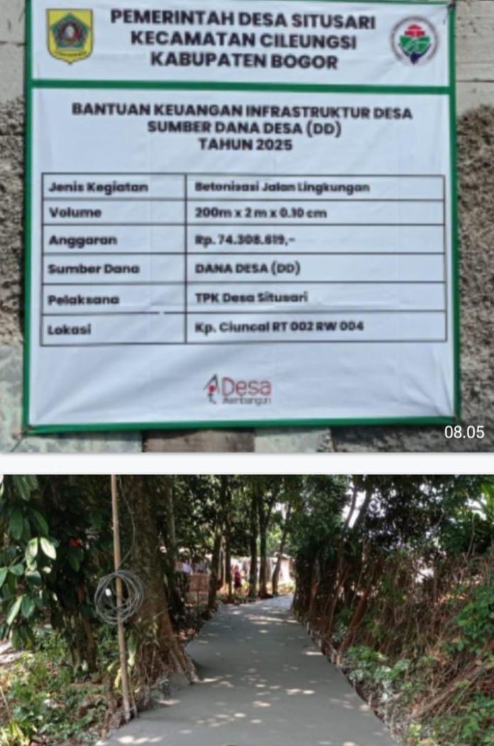 J B N Kab.Bogor– Rabu 30/april/ 2025/ pemerintah desa (Pemdes) situsari kecamatan cileungsi kabupaten bogor sedang berjalan merealisasikan pembangunan jalan desa rsumber anggaran dari kucuran dana desa (DD) tahun 2025.