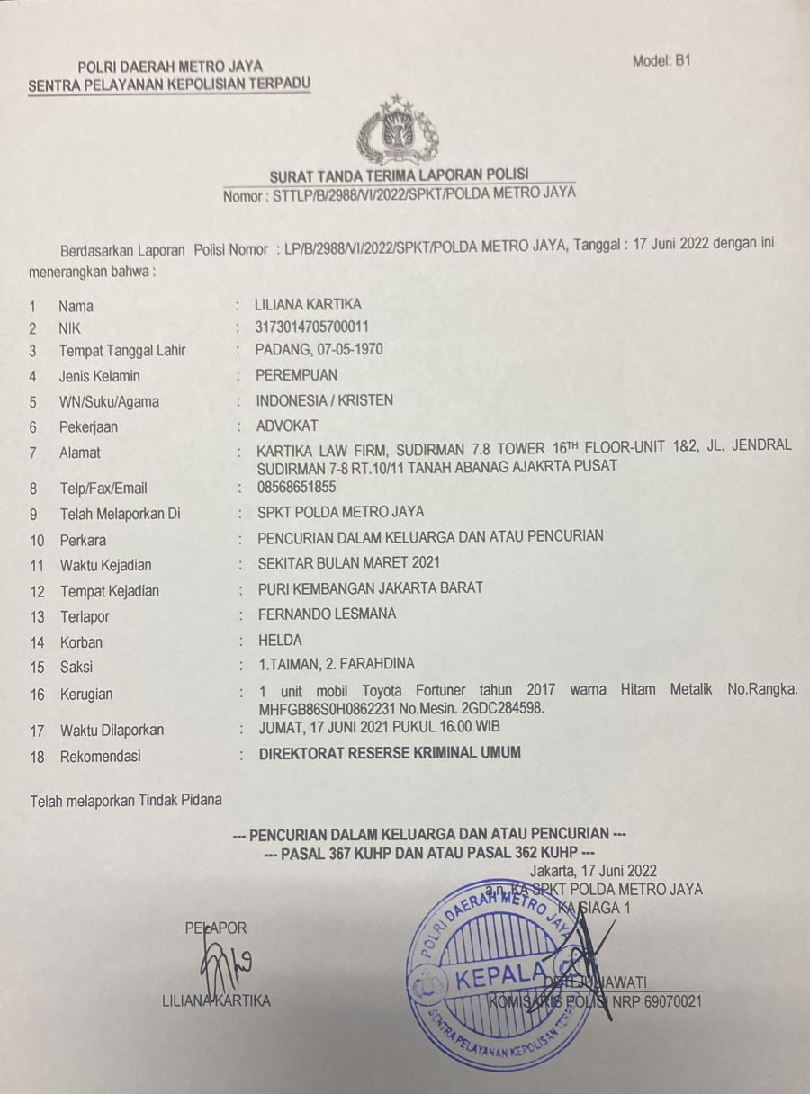 Kota Tanggerang (JBN) – Terkait permasalahan mobil toyota fortuner yang sampai saat ini tidak dikembalikan kepada atasnama kepemilikan yang sebenarnya, Lilliana Kartika melaporkan Fernando Lesmana ke Direktorat Reserse Kriminal Umum Polda Metro Jaya (PMJ).